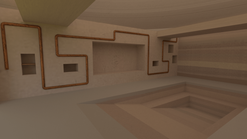 I will also have some material samples of key design features in the space. Below are images of the layered concrete cube I made as a physical representation of the flooring and south wall of the design and the copper plate representing the physicality of the copper piping along the eastern wall. These samples will give a tactile element to my presentation.