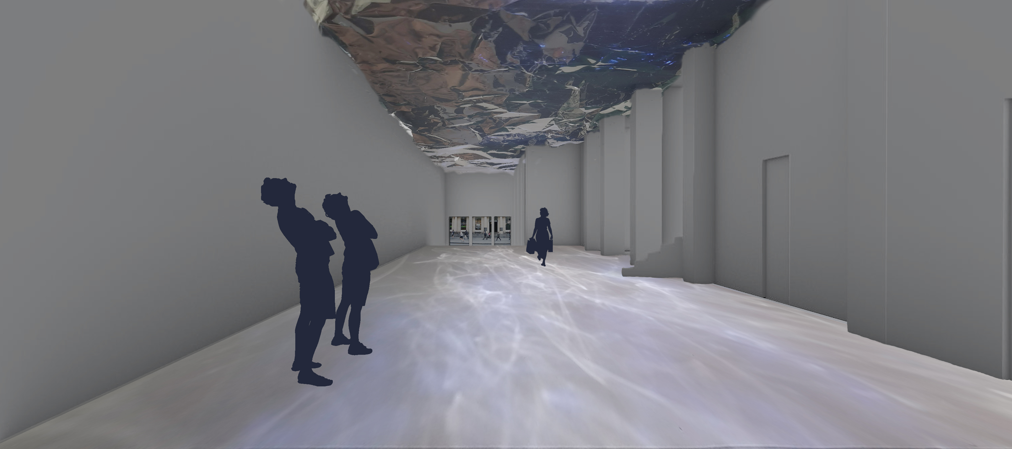 I have done this with a focus on the ceiling feature. A reflective film is suspended from the ceiling which flows down into a series of free-flowing drapes. Lights are positioned along the opposite wall which allows the fluid light reflection to project onto the floor. This was inspired by Anish Kapoor’s work.