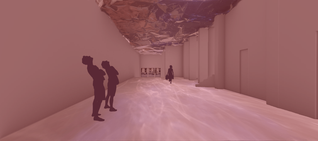 I also have a folding sheer fabric wrapping along the wall from the ceiling to the floor. This creates interest at eyelevel as well as allowing momentary interaction with the space. This feature was heavily inspired by Georgia O’Keeffe. The reflective drapes not only allow interaction with the space, but their moving light projections connect strangers through their innocent movements.