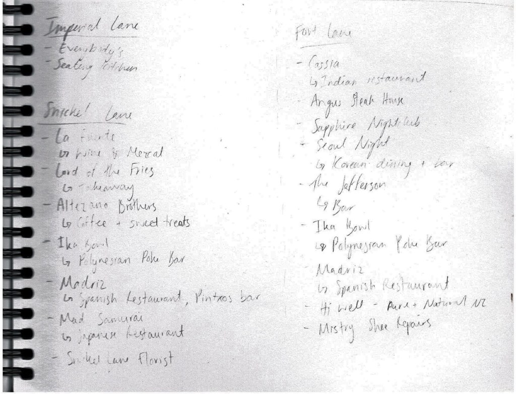 This week I started working on some important secondary elements of my design intervention. I began with some research into the cafe’s, restaurants, bars, and stores in and around Fort Lane. I looked at Fort Lane, Imperial Lane, and Snickel Lane because these are all important intersections within my design and I want to include and consider these stores in my event planning for the space.